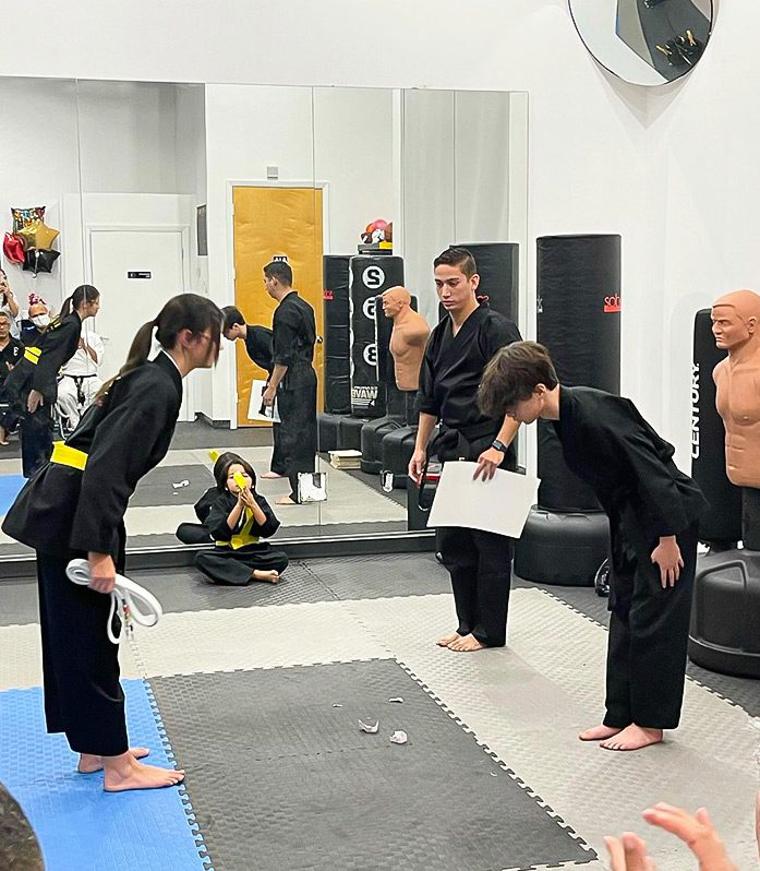 The better the student is able to concentrate and learn, and the more aware they are, the more confident they feel and the more they feel good about themselves. They are excelling and working on themselves and for themselves and have learned how to work hard to achieve their goals. While training they are staying physically fit, using their minds, and associating with respectful and caring people and friends. They are working hard for themselves, which means they see their own worth, and they are doing it with helpful friends in a supportive environment, which further boosts their confidence.